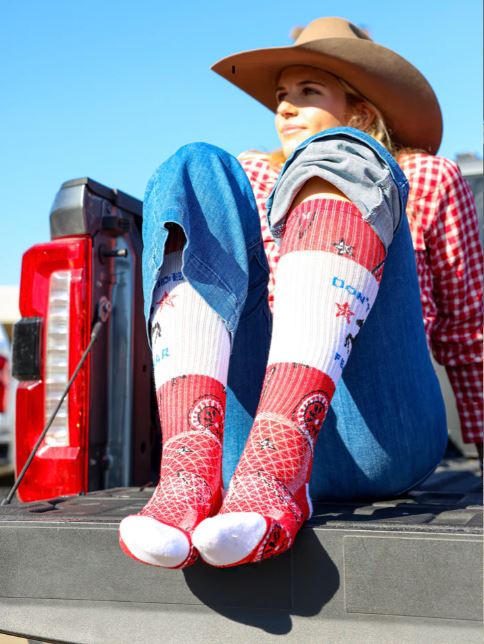 • Designed by head cowgirl Lorinda Van Newkirk, it’s no surprise these riding essentials come pack with style and well-thought-out design. They are tall enough and stay up to protect your calves and never cut the circulation off. Lucky Chuck Performance Socks softens with every wash, but without wearing out ~ meaning even more chances to wear your lucky socks every day. Everyone deserves to wear a pair of LUCKY Chuck SOCKS!!
