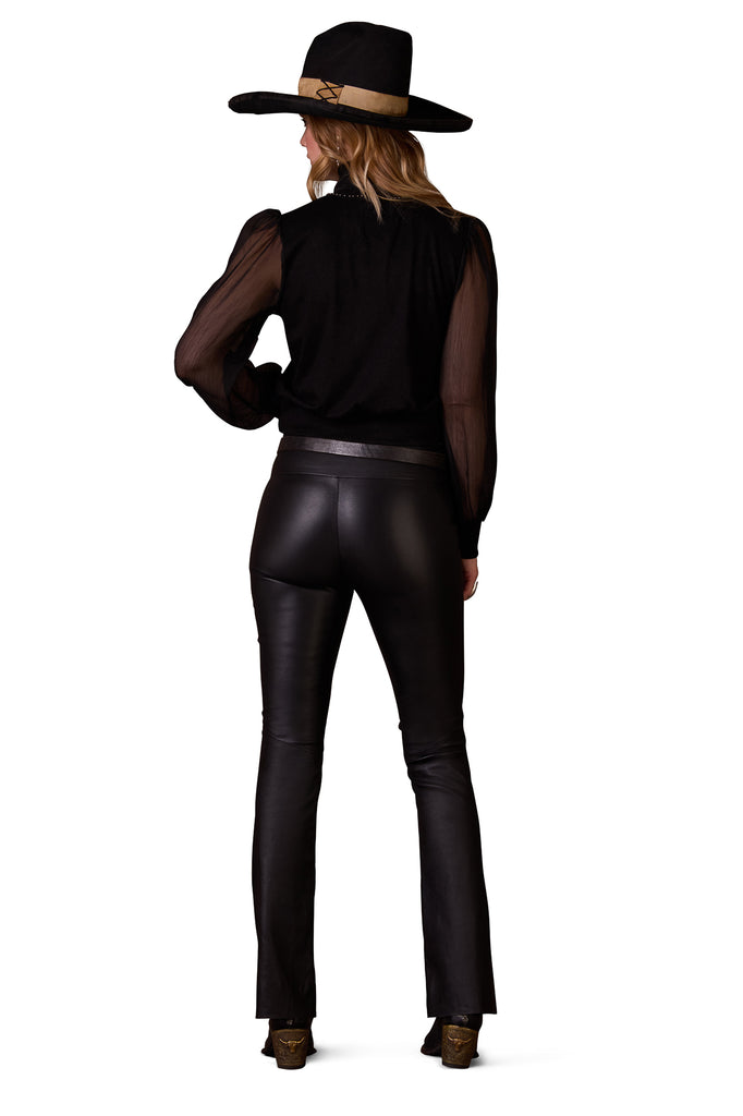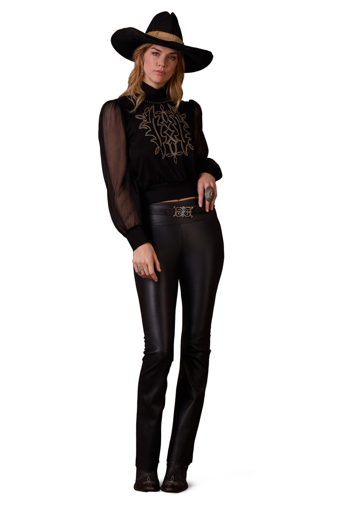 Elevate your outfit with this effortlessly elegant top. The bodice is a full-coverage fabric with a sleek mockneck, embellished with toebug style embroidery with beaded accents. It’s complemented by chic, sheer voluminous sleeves, and the cropped silhouette makes it perfect for pairing with your high-waisted jeans or barrel pants!