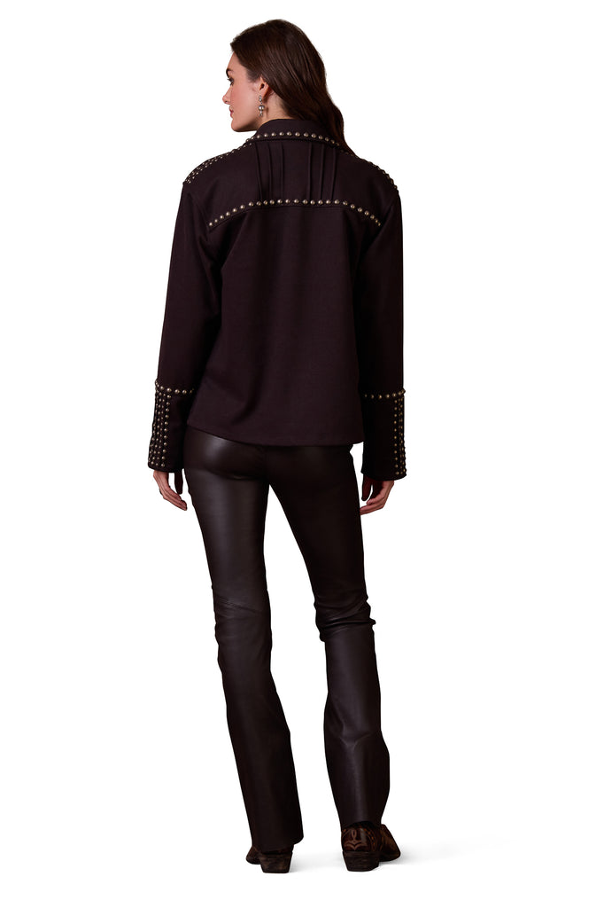 • This little beauty is like getting a two-in-one for your wardrobe; the luxe fabric has a heavy hand and the classic straight-cut button-down silhouette can easily be styled open as a jacket or buttoned up as a top. It’s embellished with pintuck pleats, butterfly concho accents, and some statement studding – signature DDR style!