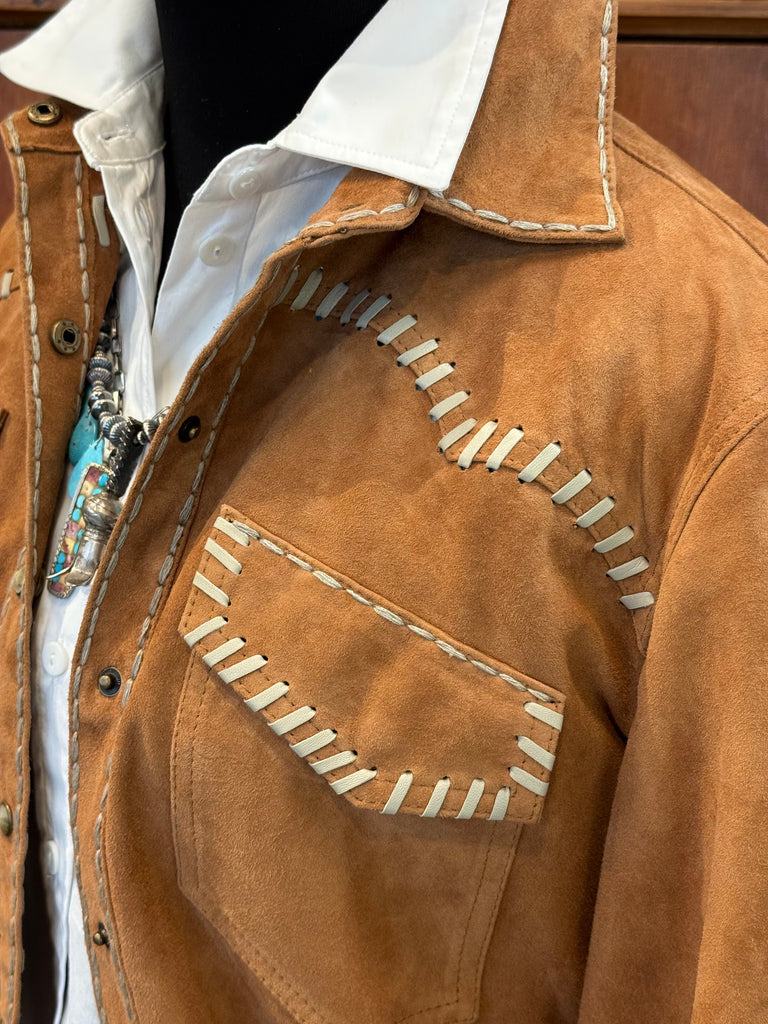 This jacket is beautiful and brilliant in every way. It’s crafted in a gorgeous ‘bridle’-hued goat suede complemented with white contrast stitching and leather whip-stitch lacing, and finished with a classic pearl snap placket. But here’s the genius of it: the effortless silhouette and neutral tone make it as easy to wear as any jean jacket, but the suede and the fringe adds an edge, so it’s essentially a staple that could become your signature piece. An absolute must-have on every account.