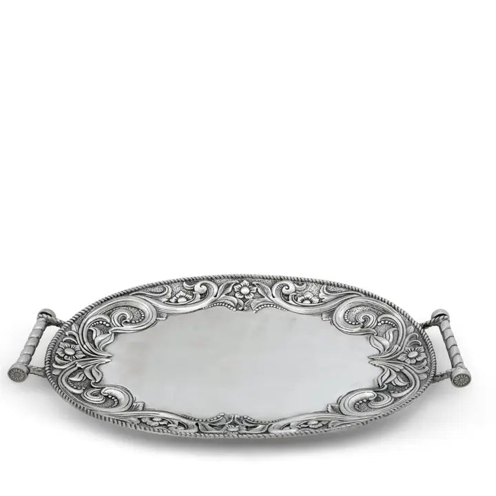 - Rimmed with the incredible, ornate detail you might find on luxury western boots and leather goods, this Arthur Court Western Leather Serving Tray is true art in aluminum. Serving space is without detail to showcase your culinary offering. Sturdy, solid handles feature roll and scroll design work. Size: 22.5" L x 14" W Care: Wash by hand with mild dish soap and dry immediately - do not put in dishwasher.