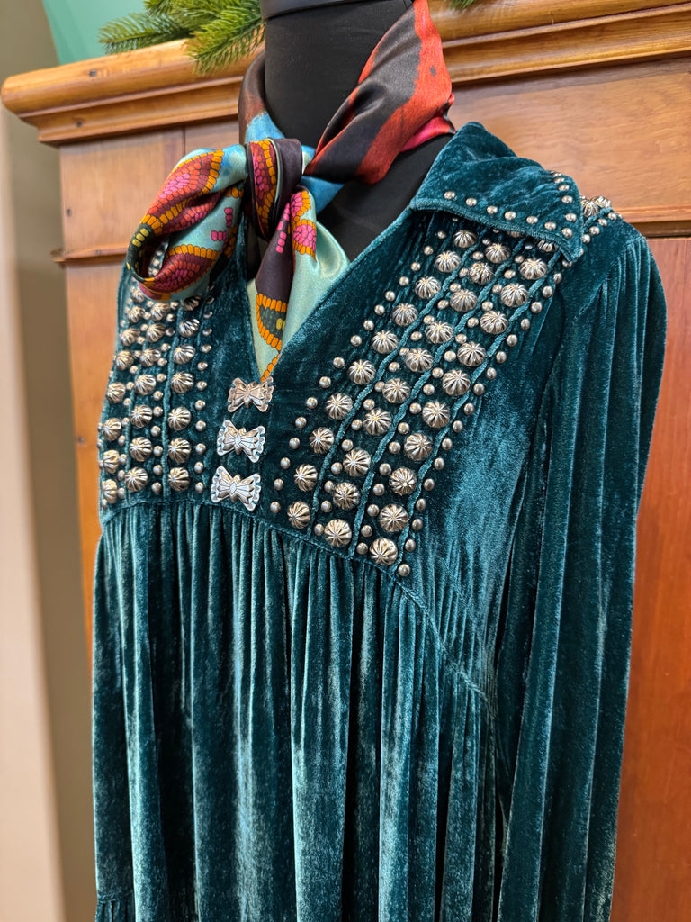 How could we possibly drop a holiday collection without a luxe velvet maxi? This beauty went on wish lists the second it was sneak-peeked! The silhouette is a full-length long sleeve with gathered tiers that give it a flattering fit and flow, and it boasts a demure-but-alluring shallow V-neck that’s finished with a collar for an extra pop of class. It’s embellished with custom concho accents and traditional metal studding that enhance the overall southwestern aesthetic. Obviously, it’s a must – and you might need it in more than one color!