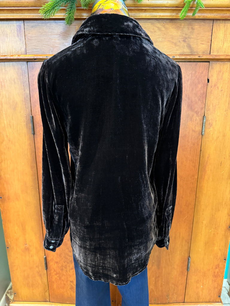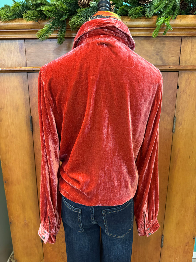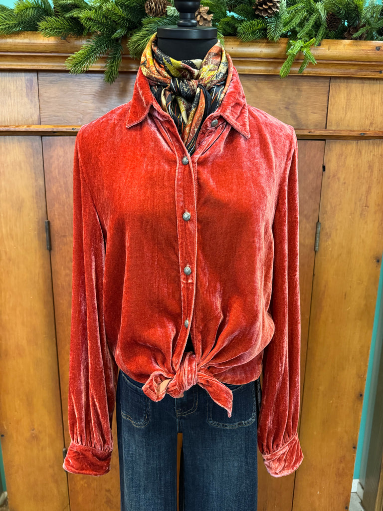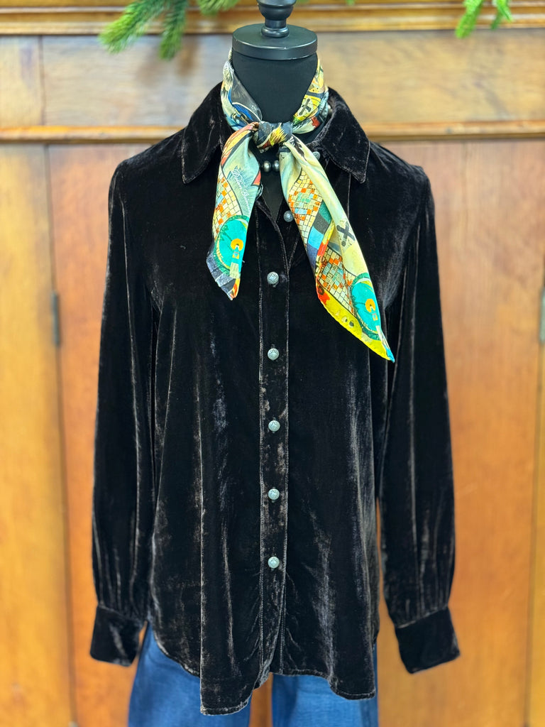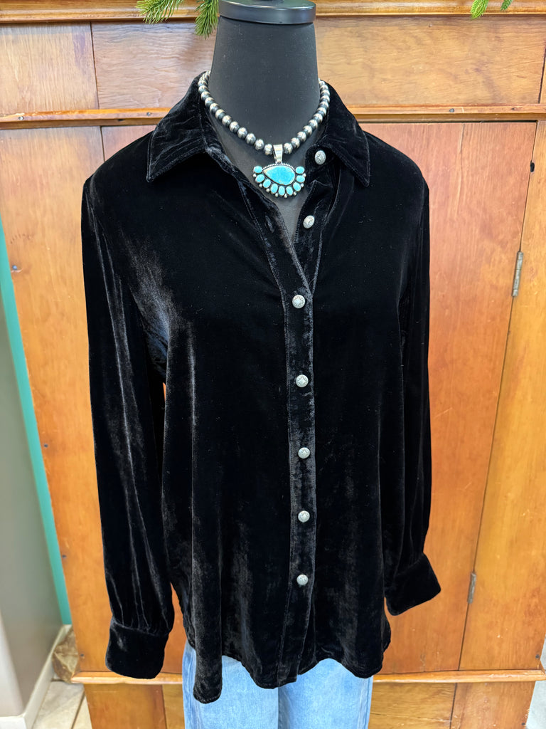 This luxe velvet button-down is an instant favorite. As a simple solid, it’s versatile enough to stay in constant rotation in your wardrobe, and it’s luxe enough to elevate any look. The classic silhouette features full sleeves and fitted cuffs, and is finished with metallic stud buttons. It’s easy to wear tucked or out, or even open over a cami. Trust us, you’ll want it in every color.