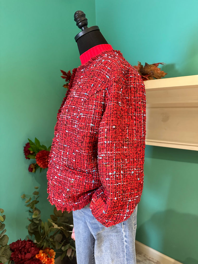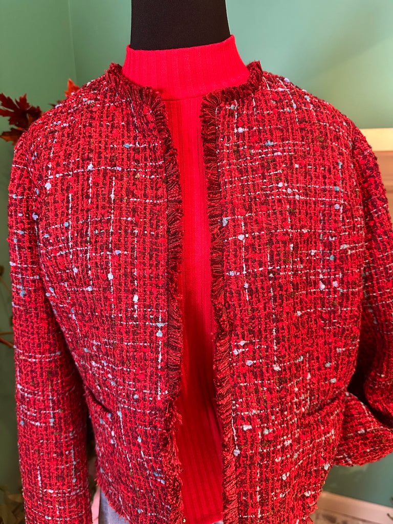 Our collarless jacket with frayed edges is the epitome of chic sophistication. This boucle jacket is designed to be a standout piece in your wardrobe, effortlessly combining classic tailoring with modern details. Whether you're dressing up for a business meeting or adding a bit of flair to your casual ensemble, this collarless jacket is incredibly versatile.