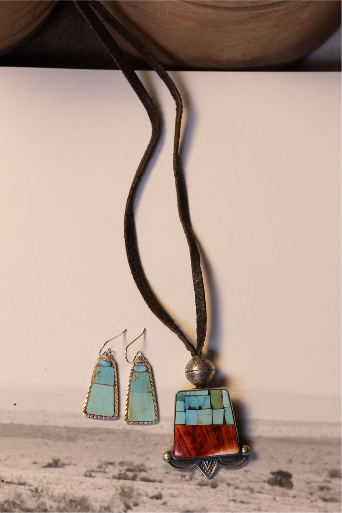 - The pendant is in laid with turquoise and Orange spiny oyster