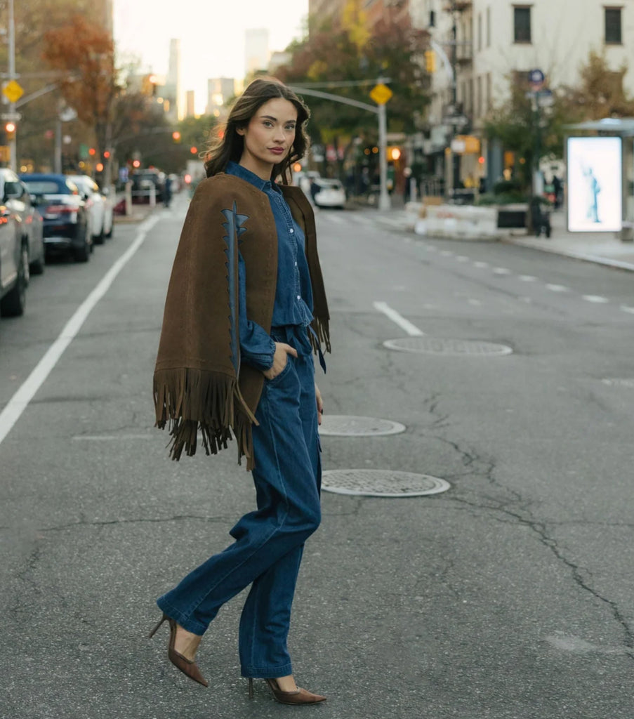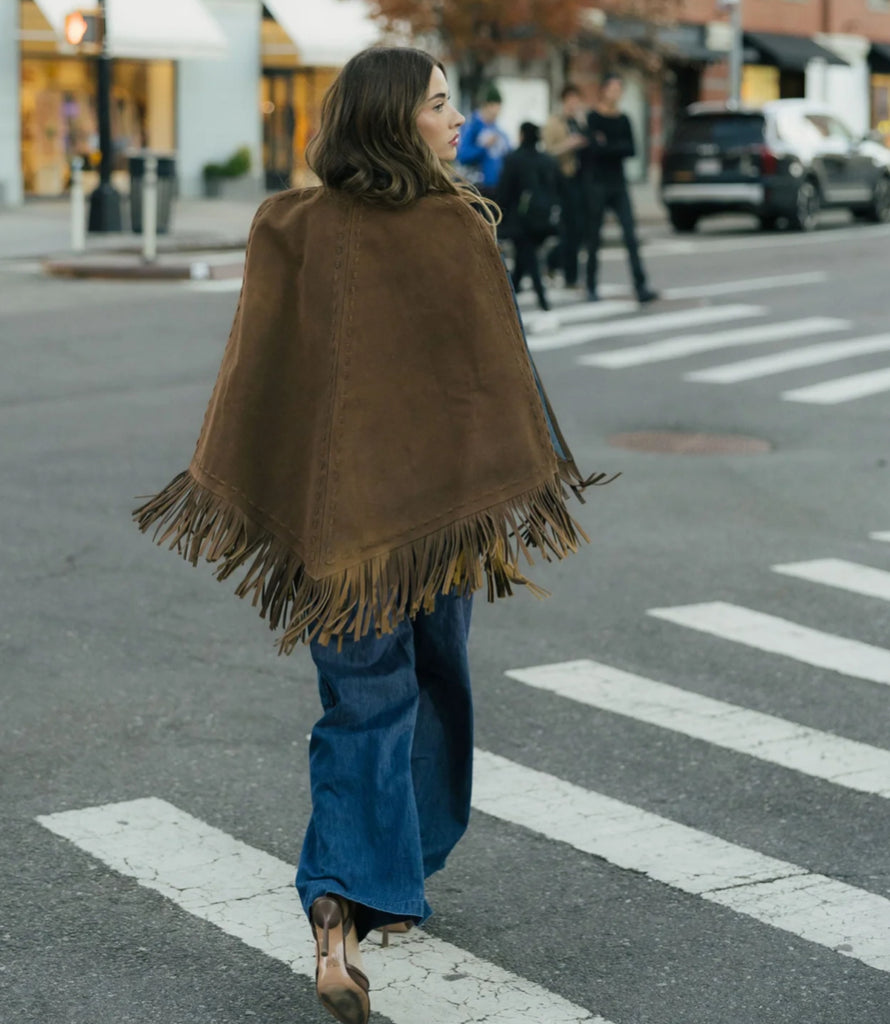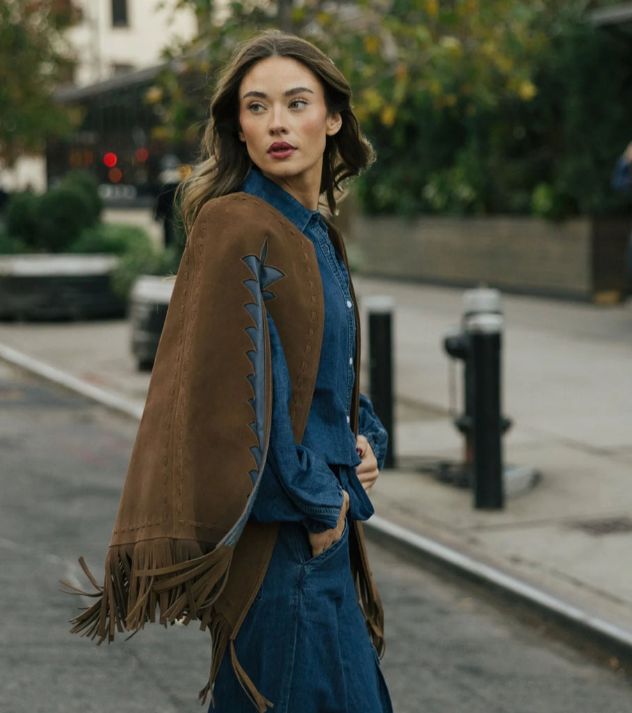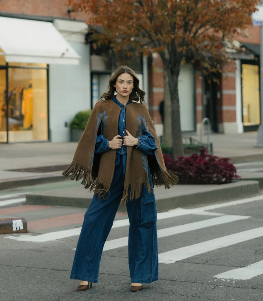 Raise a glass to our newest cape style—a bold and timeless design that’s ready to take you anywhere. Inspired by the retro '70s, this standout piece blends fun, Western classic charm with modern versatility. Crafted from rich milk chocolate suede, it features dusty blue reverse appliqué boot-stitch inspired pattern, accented by fringe, whipstitch lacing, and arm slits for comfortable wear. Designed in the USA for cowgirls everywhere.