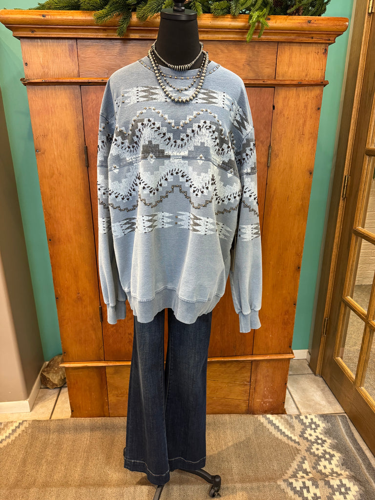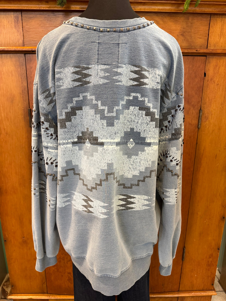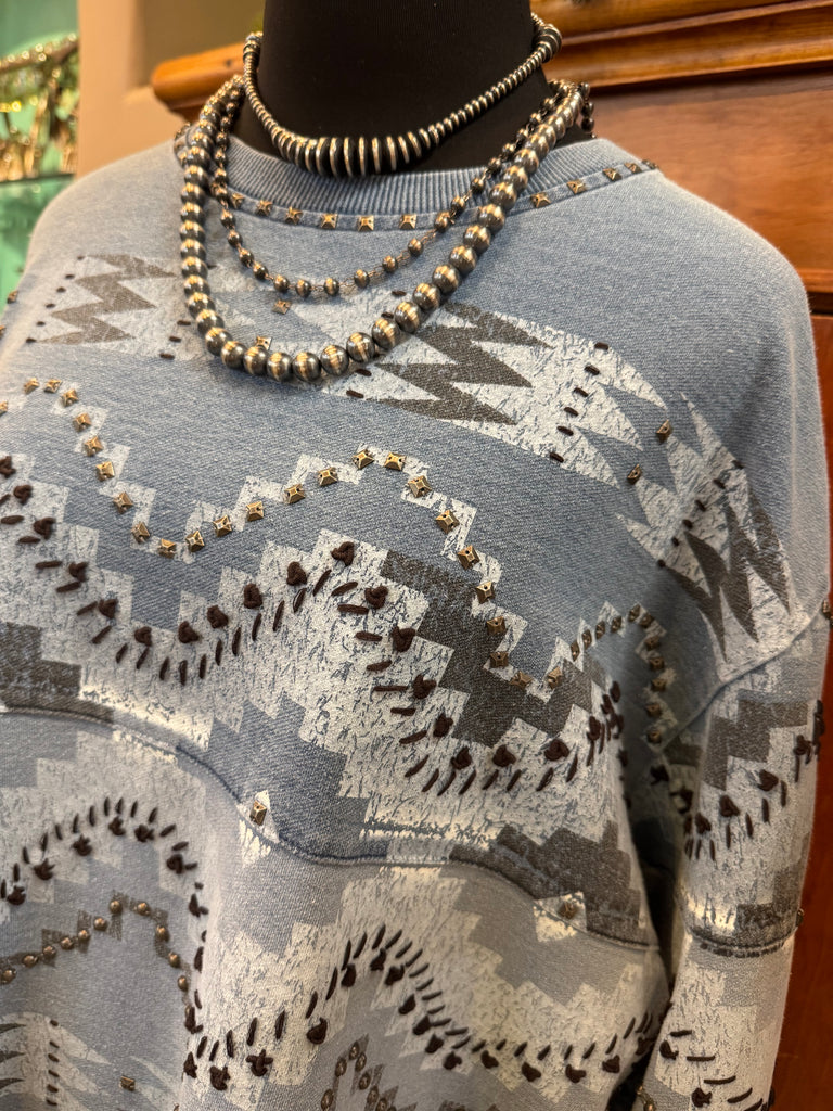 This darling top is designed to give the appearance of well-loved denim, embellished with an embroidered southwestern blanket pattern accented by subtle studding. It’s the perfect grab-and-go garment to elevate your everyday outfit.