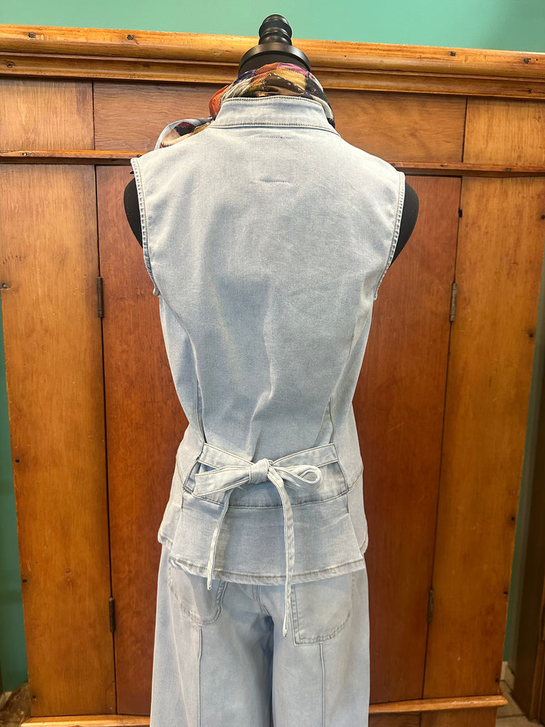 - All the polish of a Vest, none of the bulk. Button front and tailored seams shape your torso while the back tie lets you cinch or loosen as needed. Medium stretch moves when you sit, drive, or reach for the top shelf. The light blue layers easily over your favorite tops.