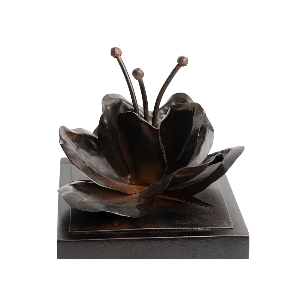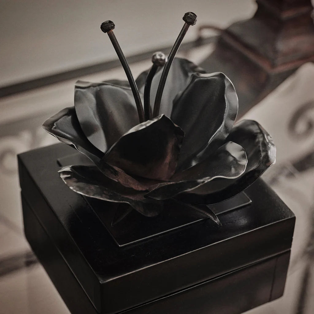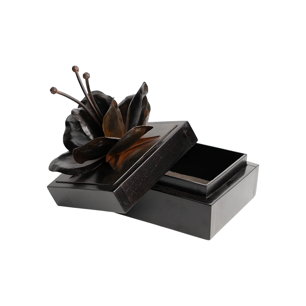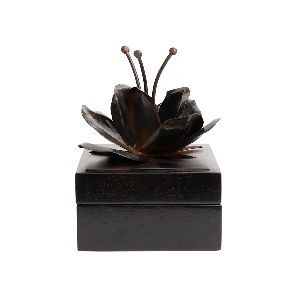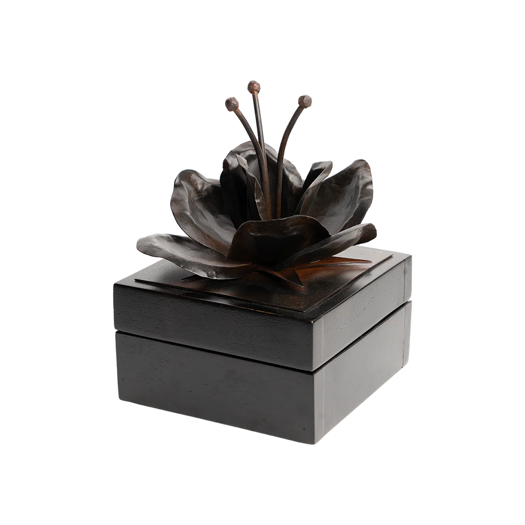 Beautiful hand carved square wood box with large, hand forged iron flower lid. Lined with suede