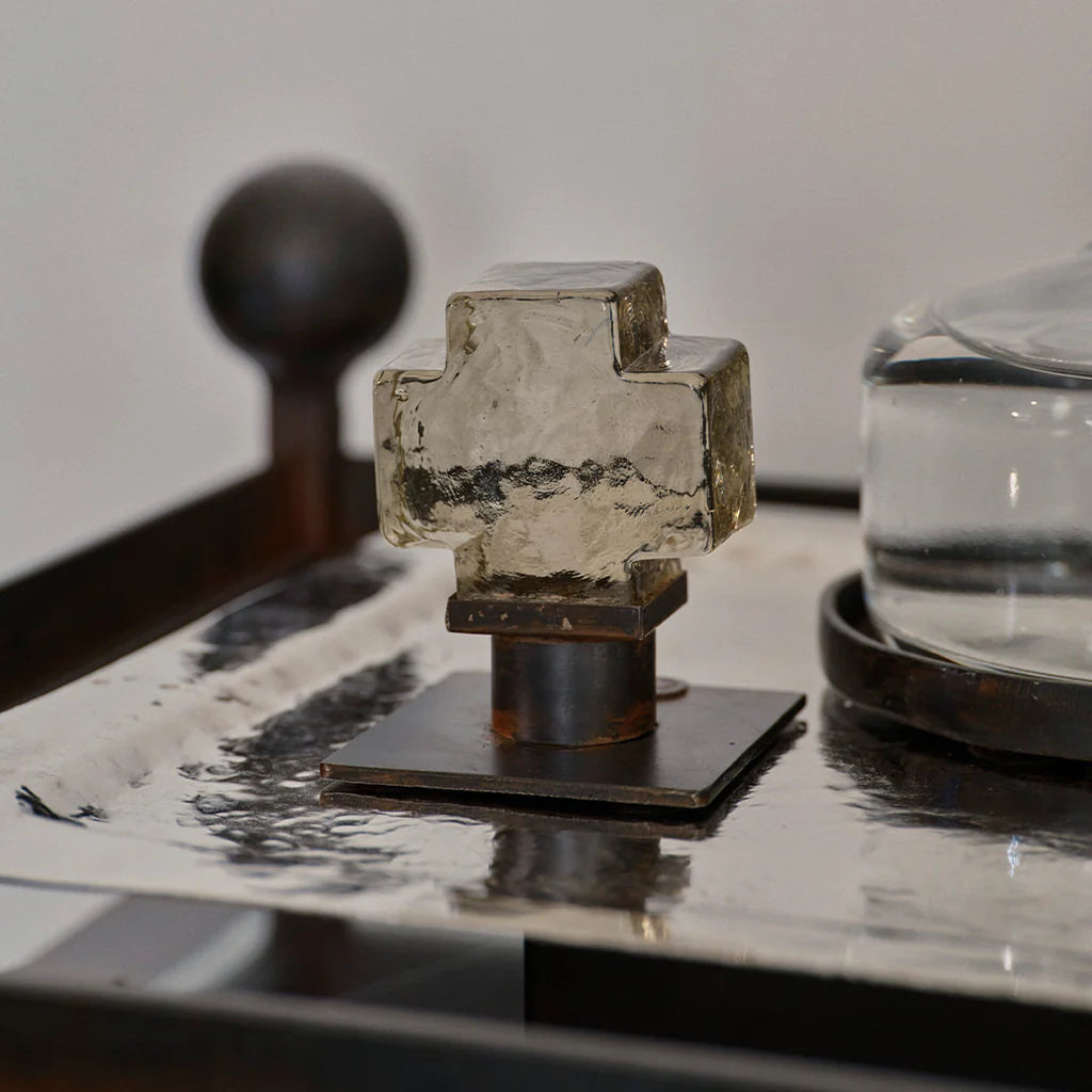 Mini mouth blown glass cross on iron stand