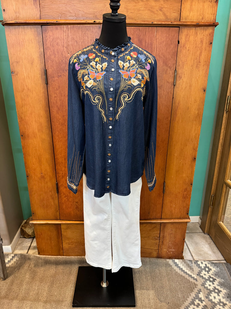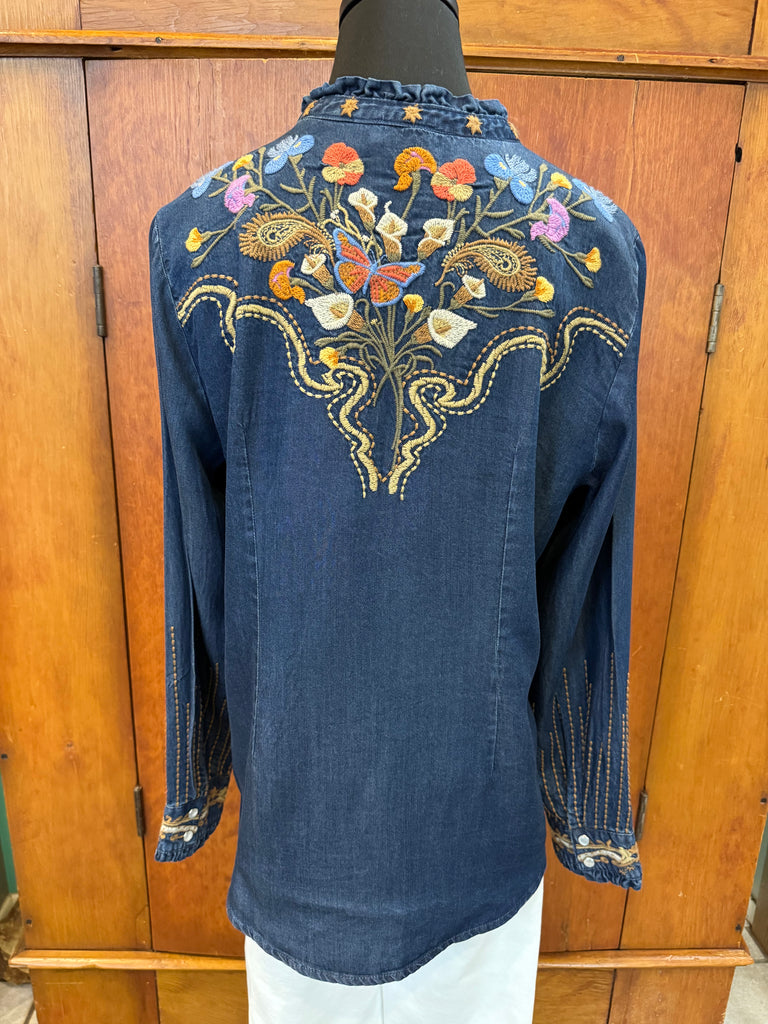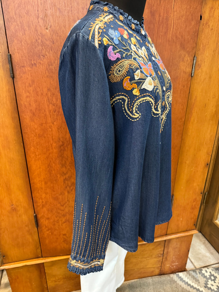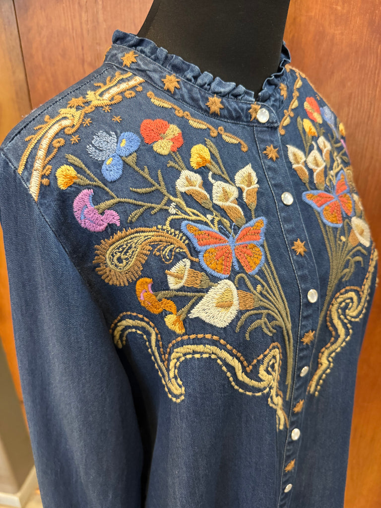 • Beautiful embroidered floral adornment on front, sleeves, and back