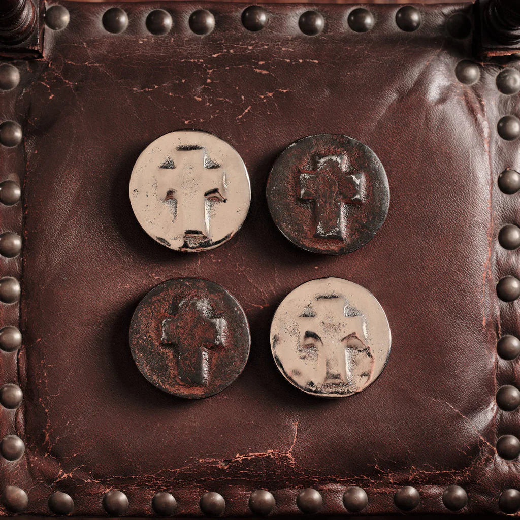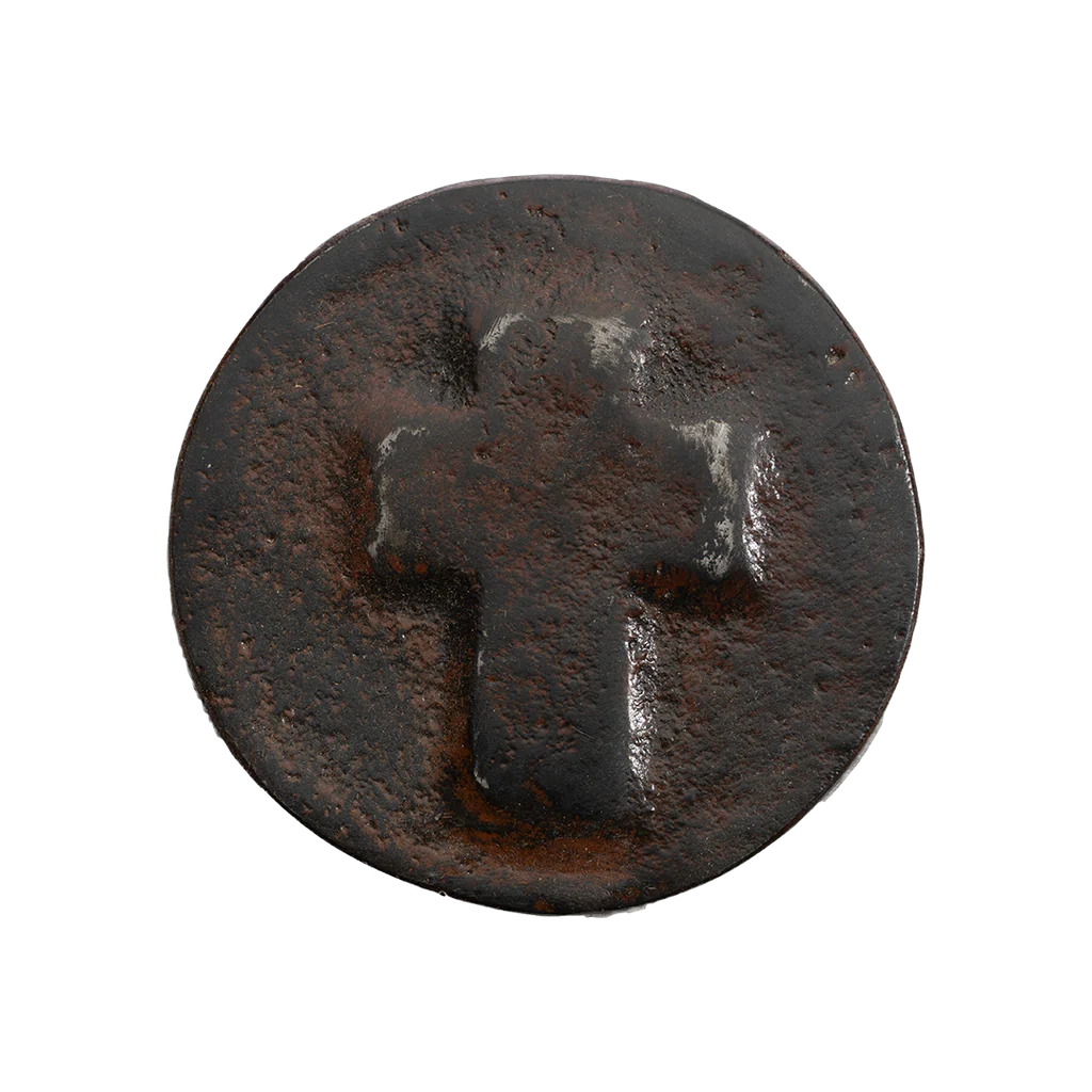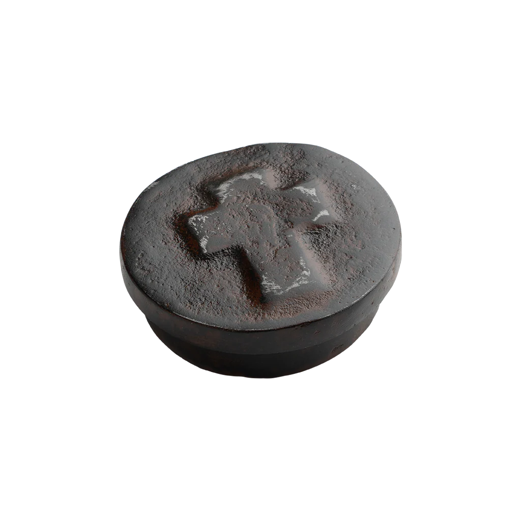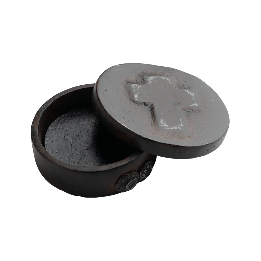 Small circular leather-lined house blessing cast iron box . . . jewelry, first communion, baptism, coins